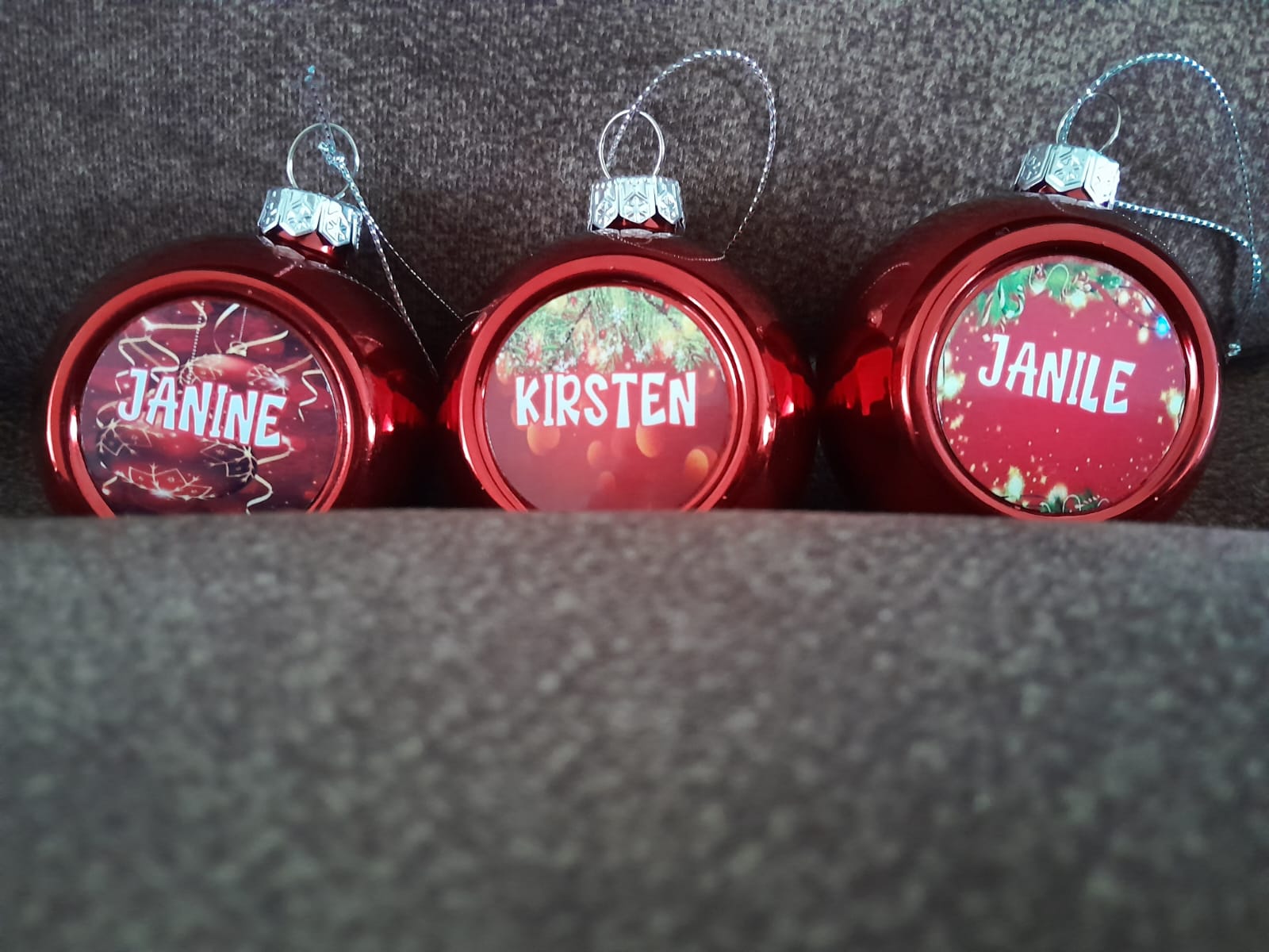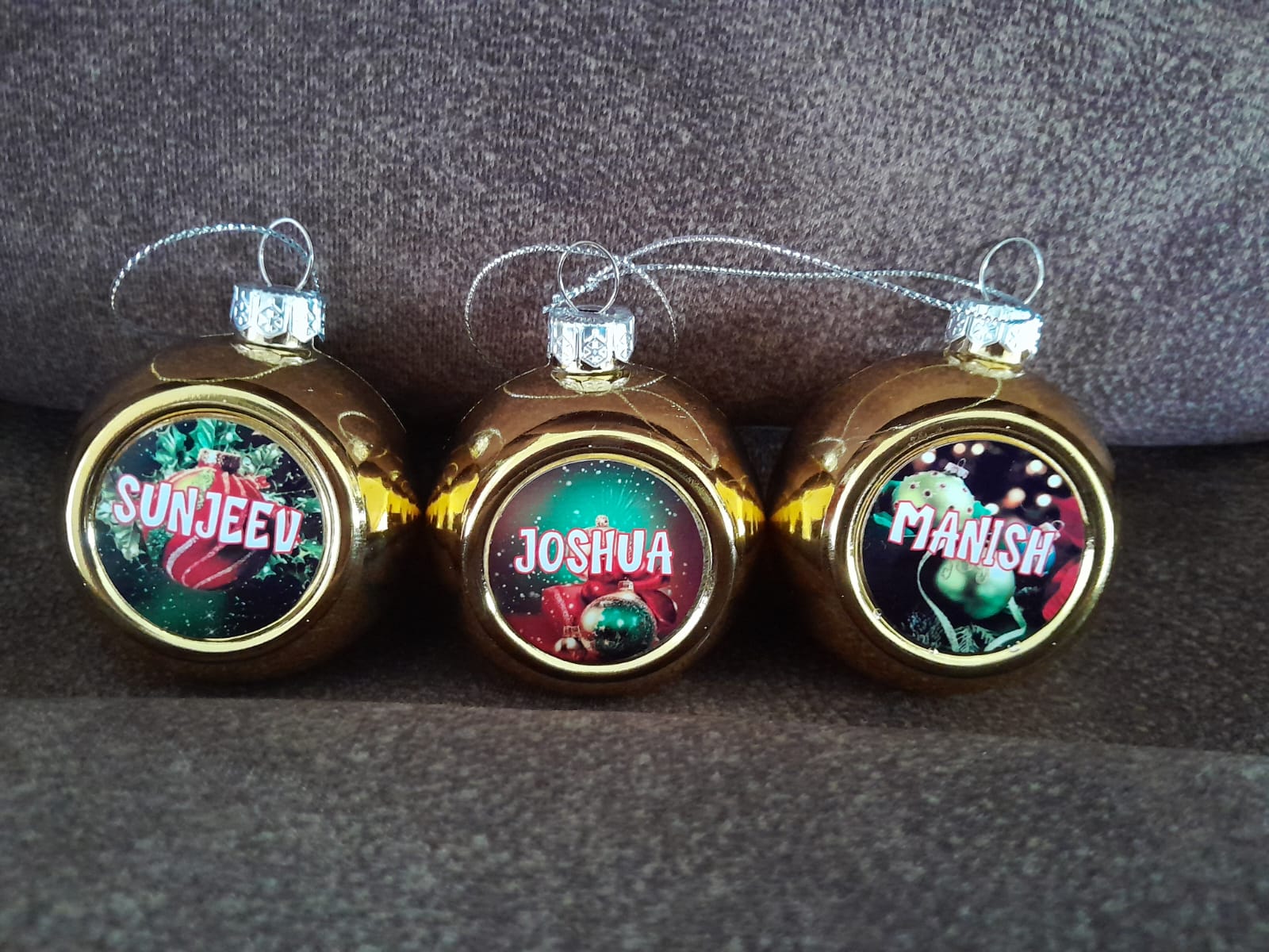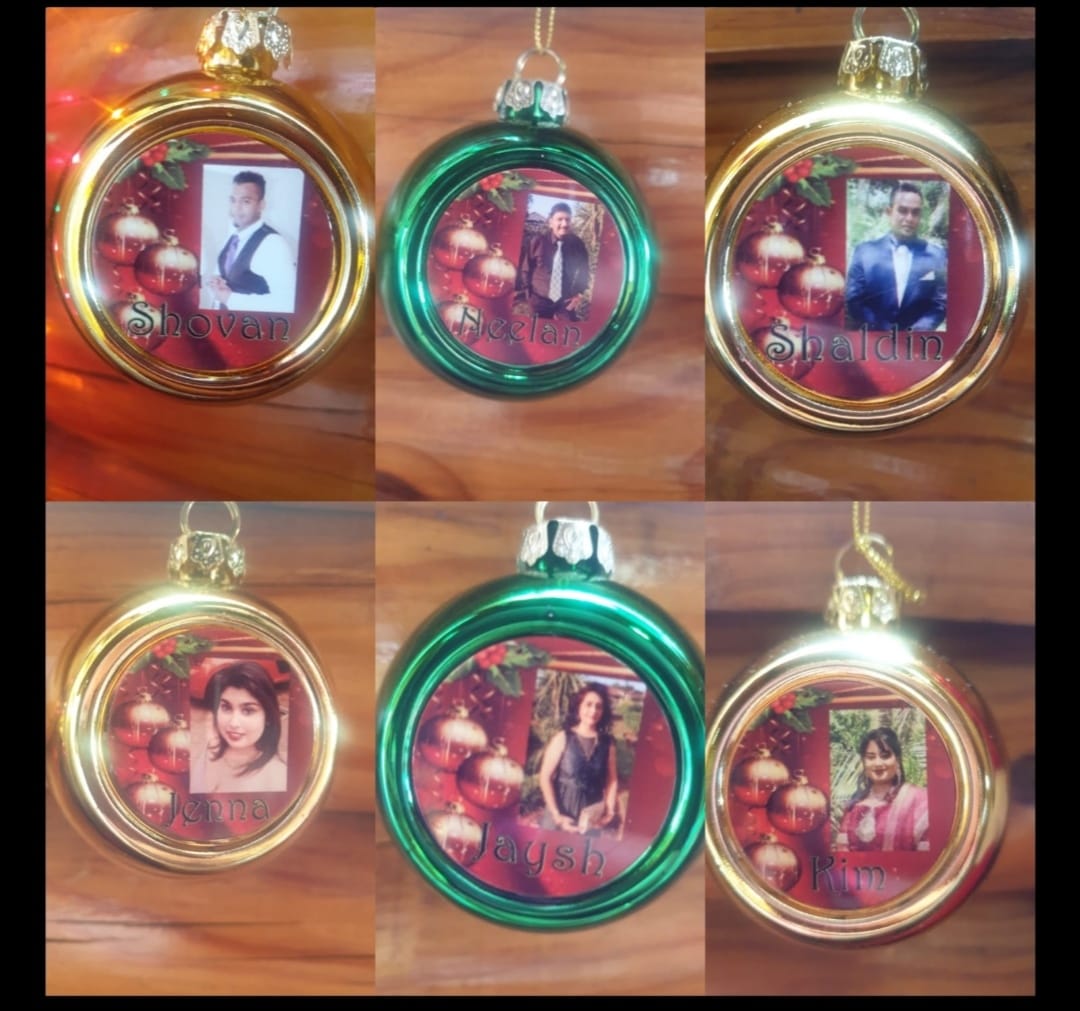 Hanging Christmas photo balls printable on metal insert with special pics, memories or names and festive designs. Available in green, red, gold & silver.