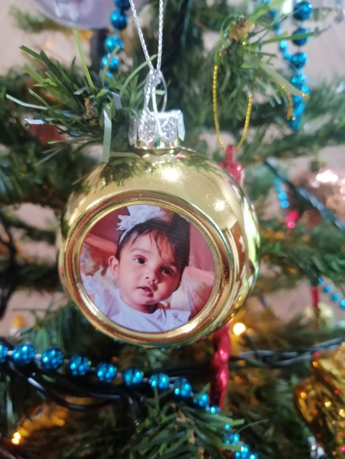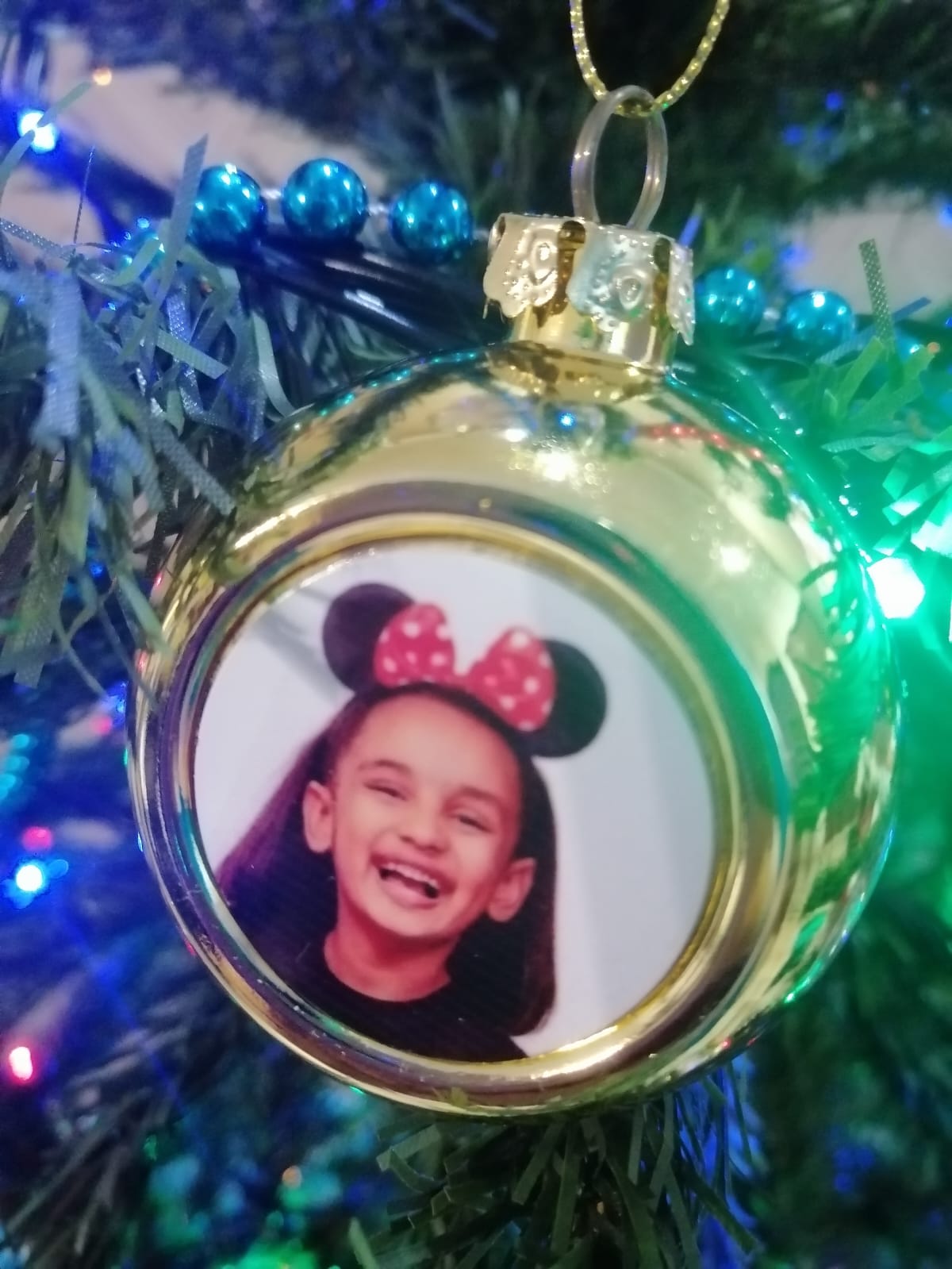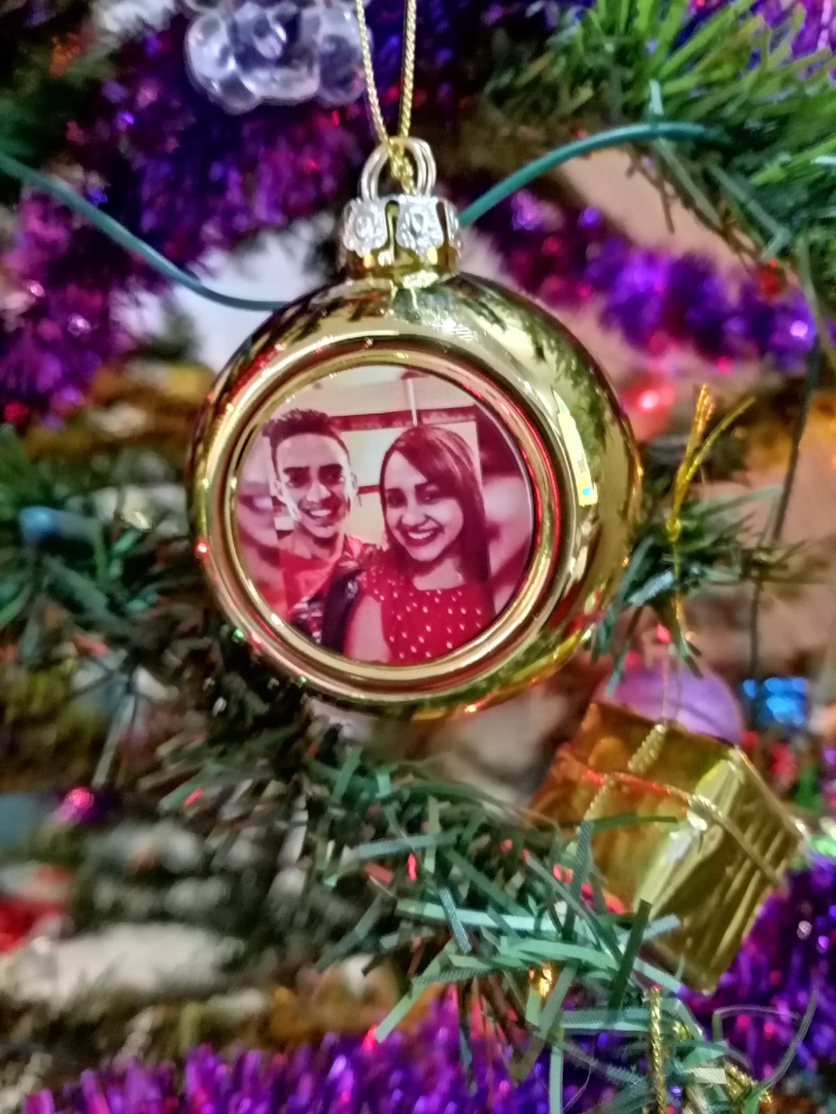 Hanging Christmas photo balls printable on metal insert with special pics, memories or names and festive designs. Available in green, red, gold & silver.