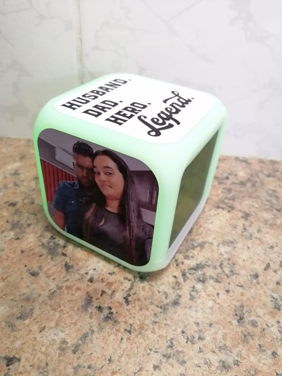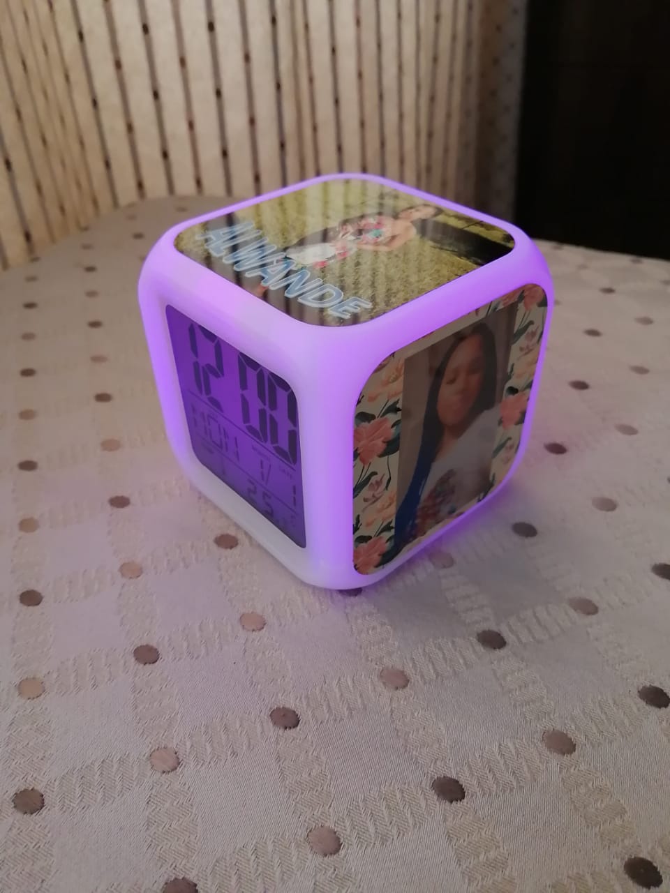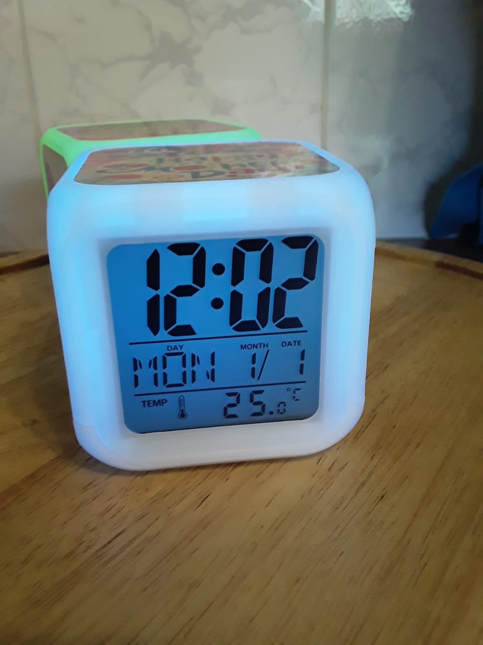 Digital alarm clock that has a colour changing light and 4 sides to personalise on