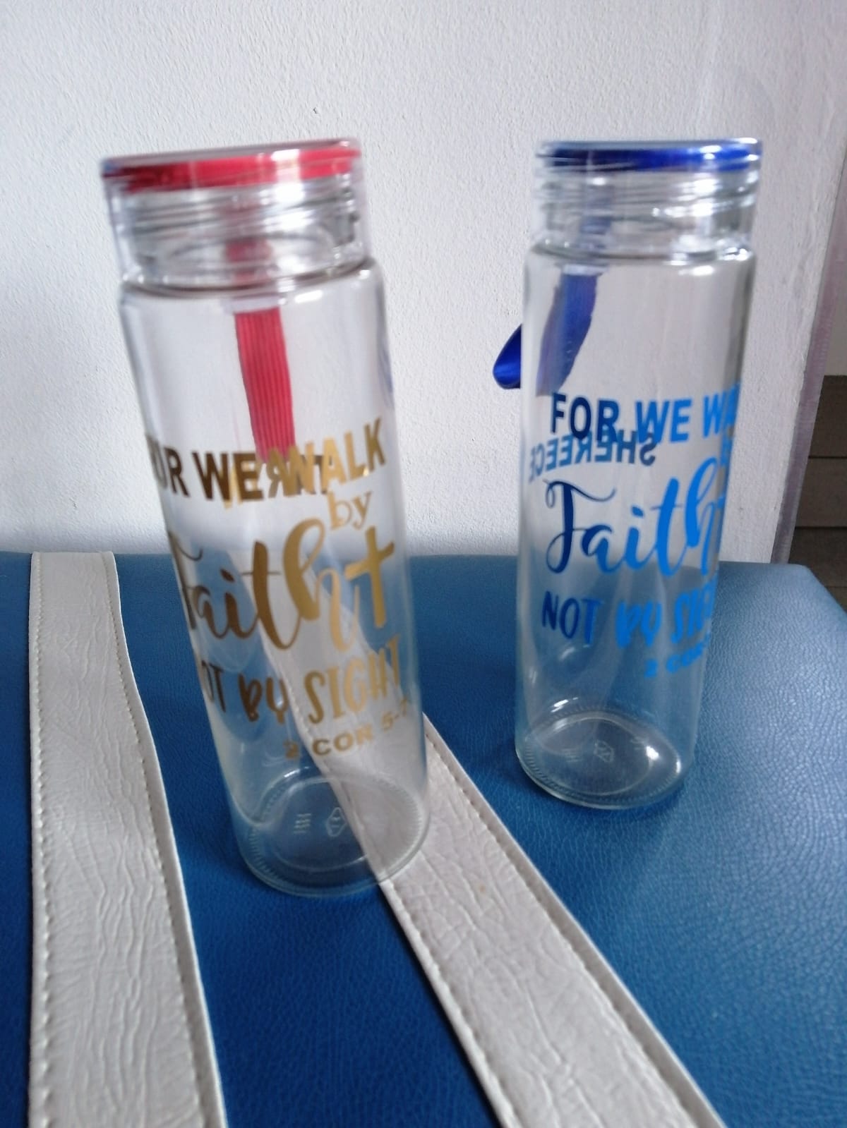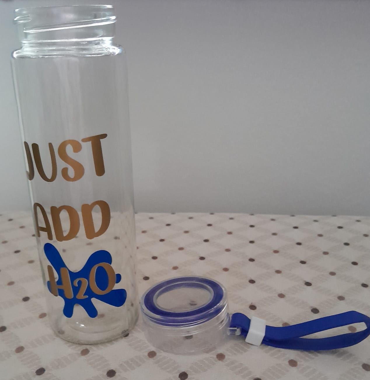 Personalised with vinyl sticker. Convienient strap to carry bottle.