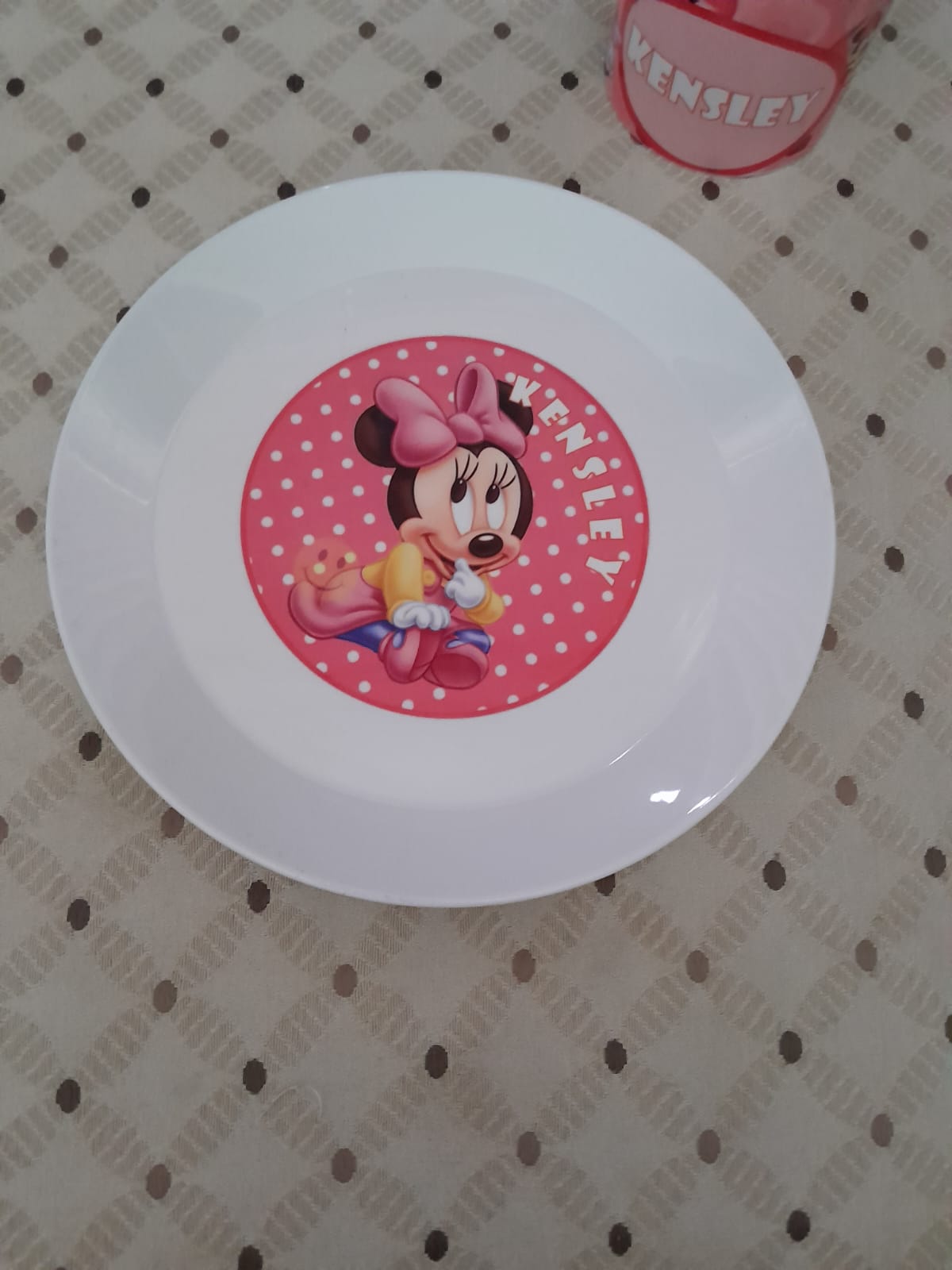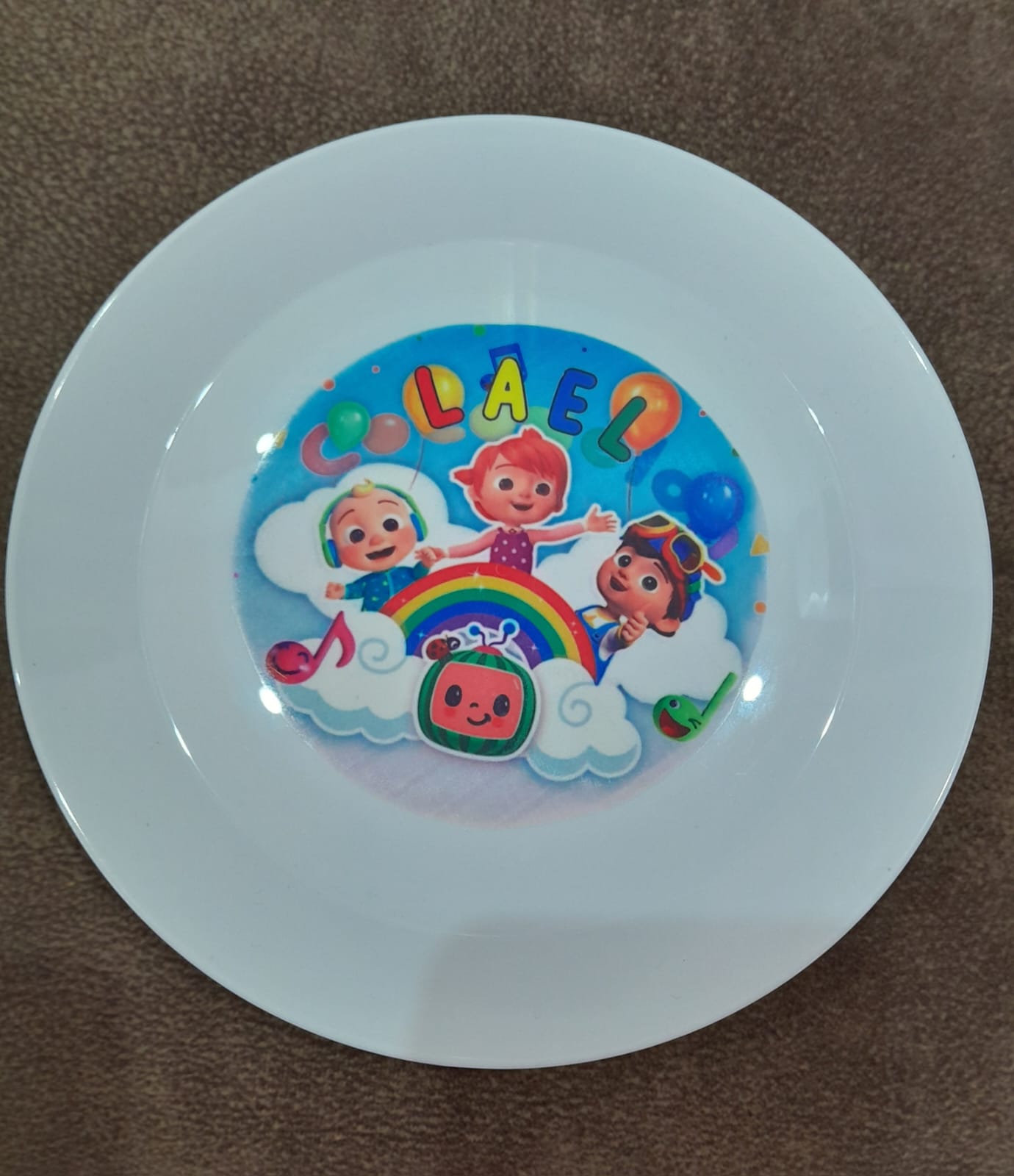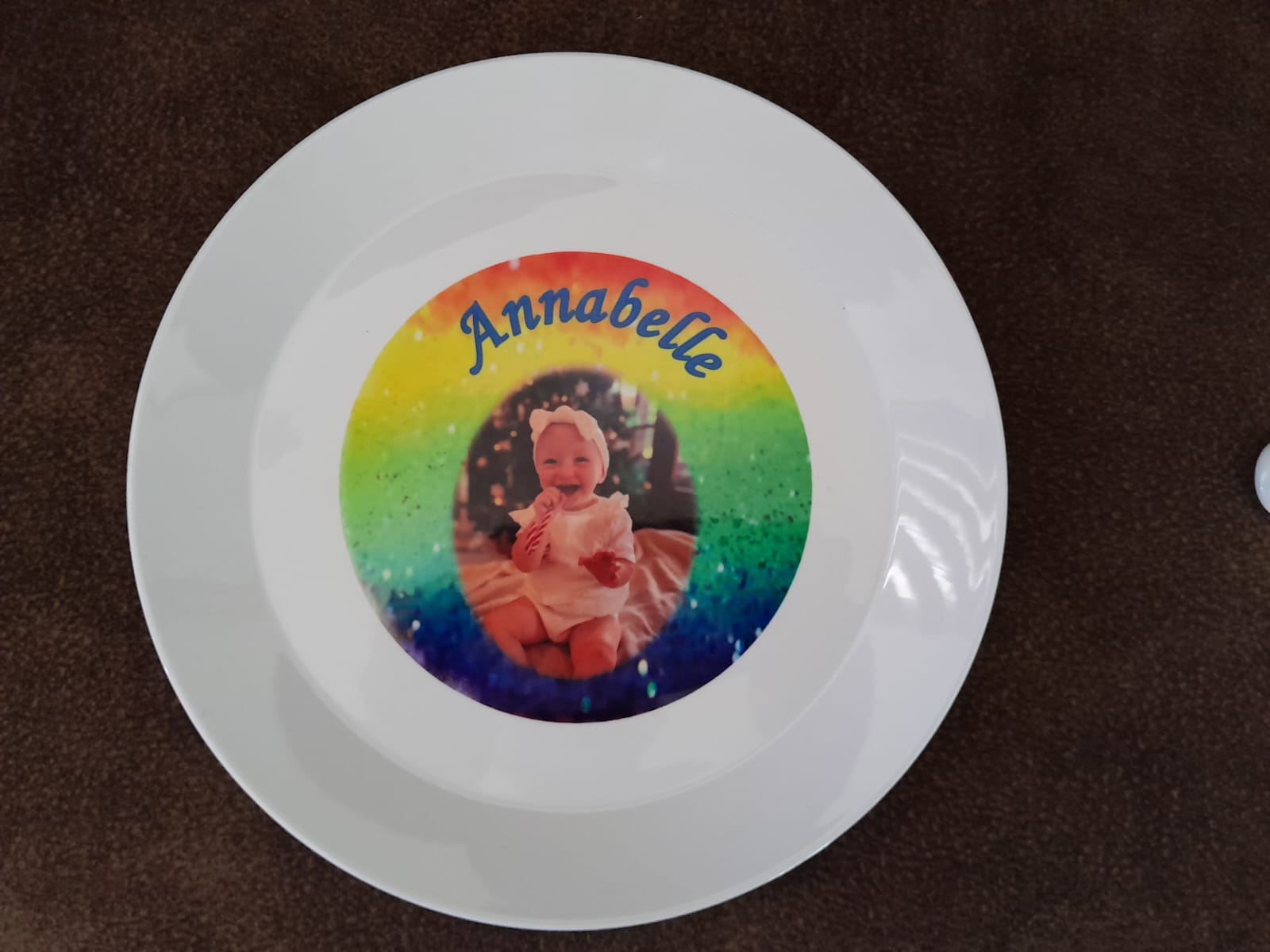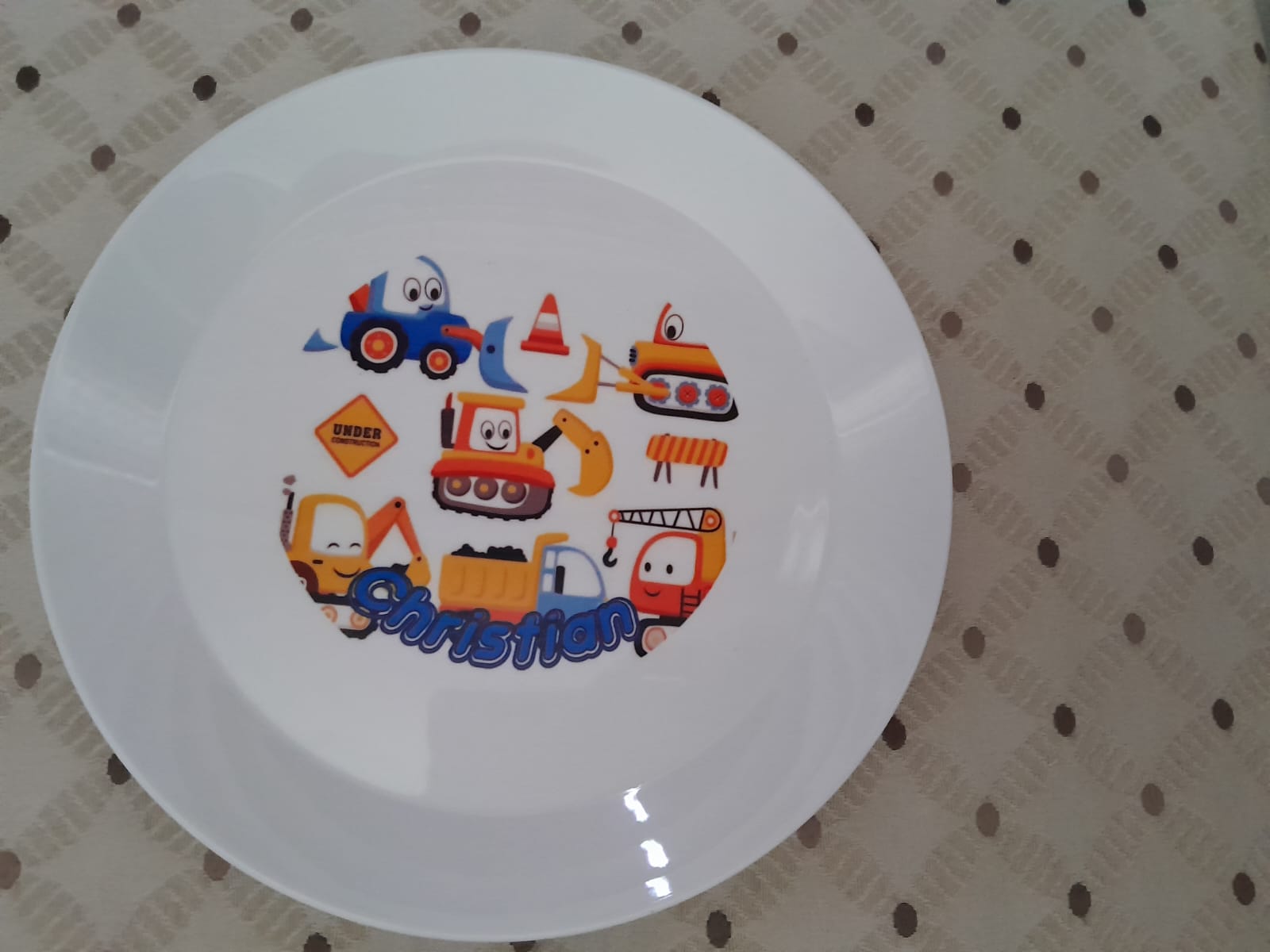 Plastic (polymer) plate that can be personalised with an image and name to make eating time extra special and exciting for kids. 100% Food safe but not dishwasher safe