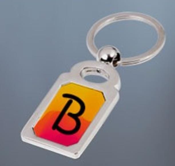 Metal keyring with rectangular shaped area for printing – single sided and of good quality.