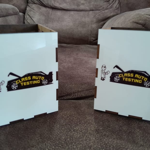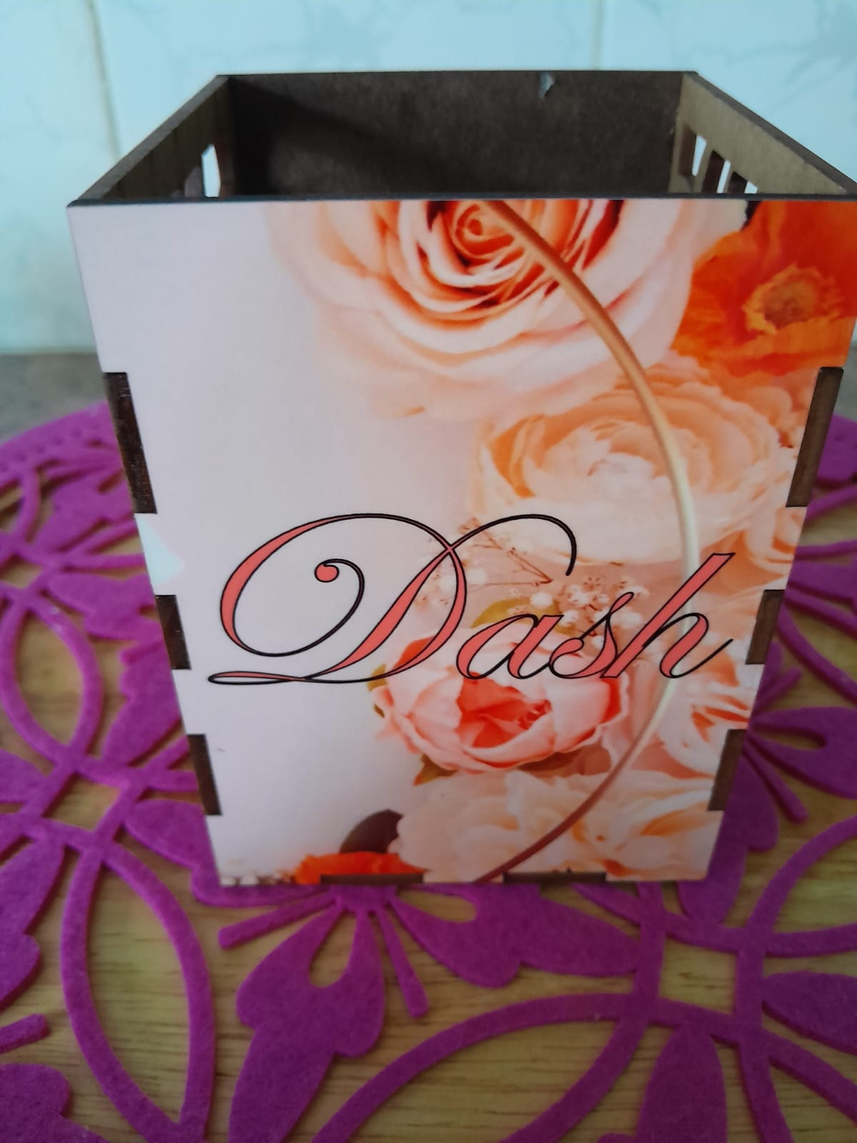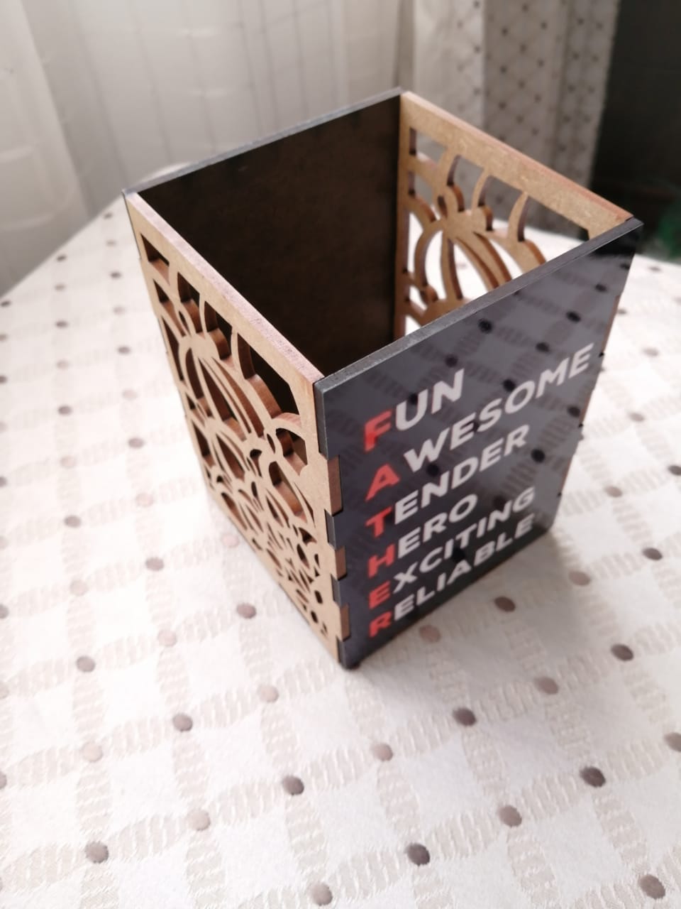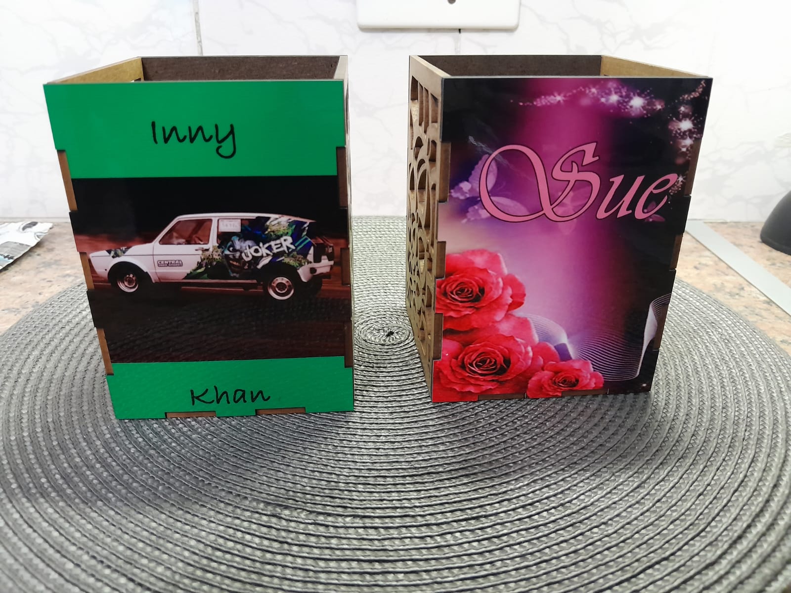 + Free PickupHardboard multi purpose holder eg. Pen holder, desk organizer or candle holder. Perfect for the office. It has 2 printable sides and 2 lazer cut side lattice effect that are glued together. Can hold a large amount of stationery and has a high gloss finish.