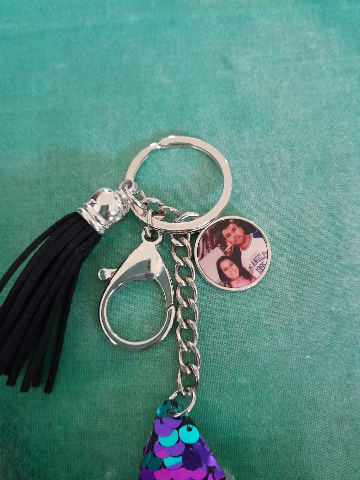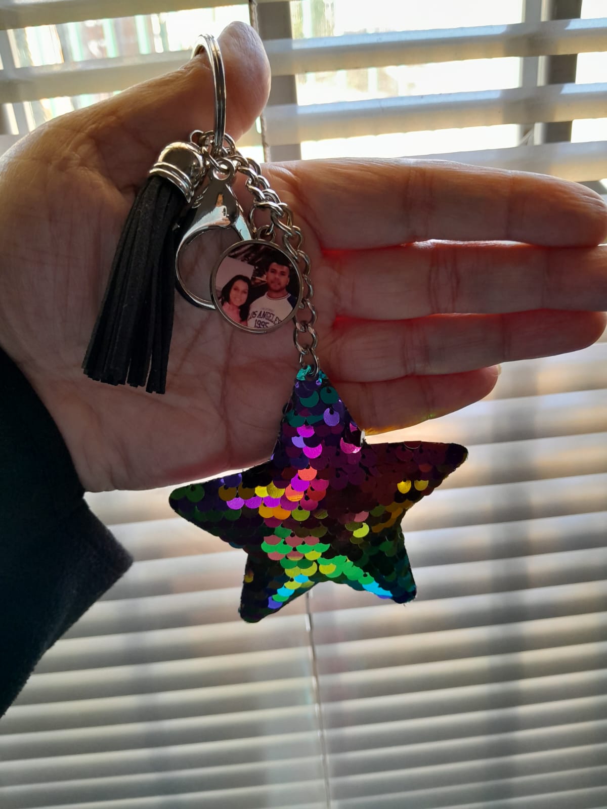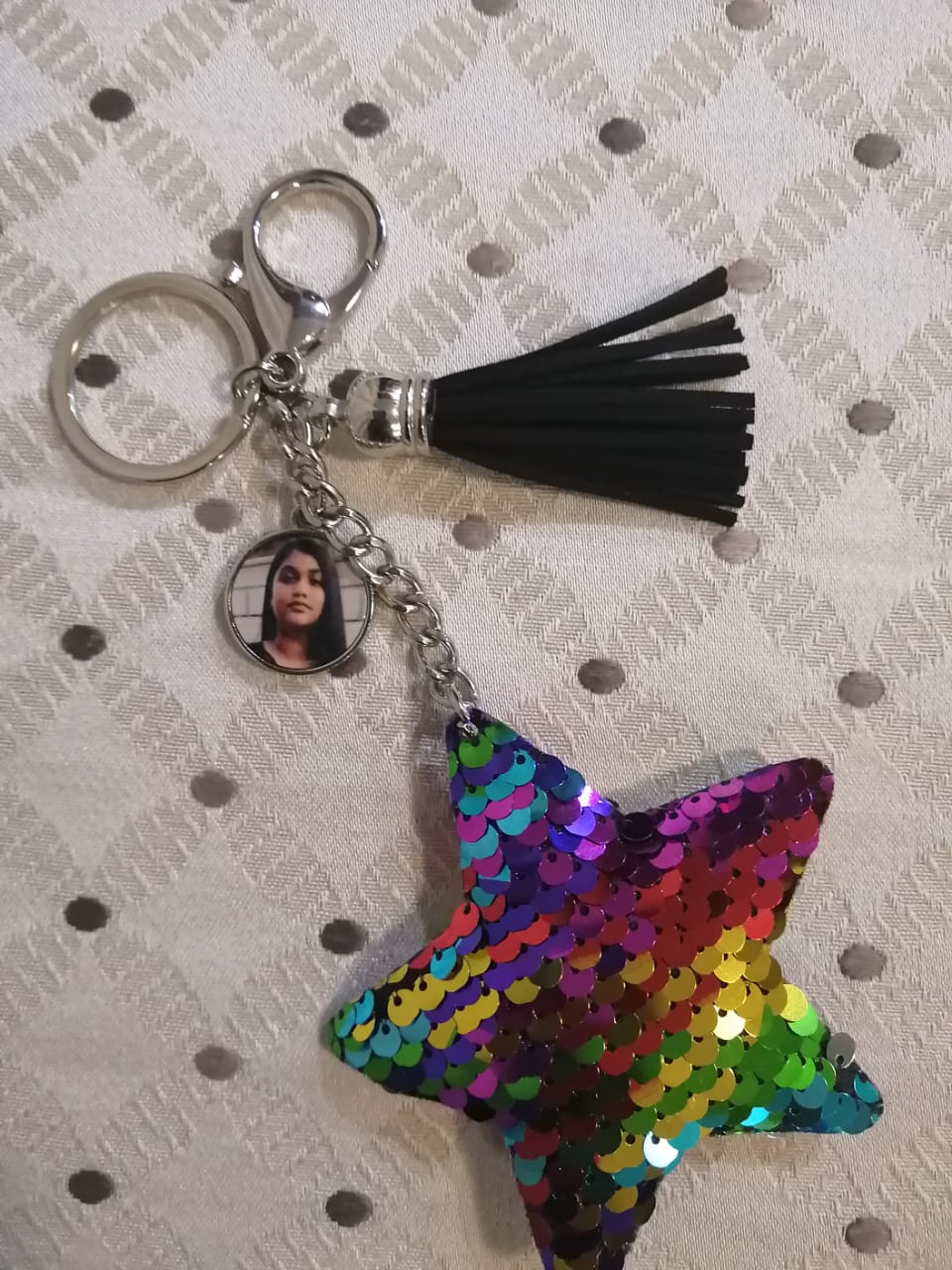 Sequin star keyring with circle charm that can be personalised.